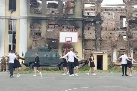 Estudiantes ucranianos bailan frente a las ruinas de su escuela. Captura de pantalla