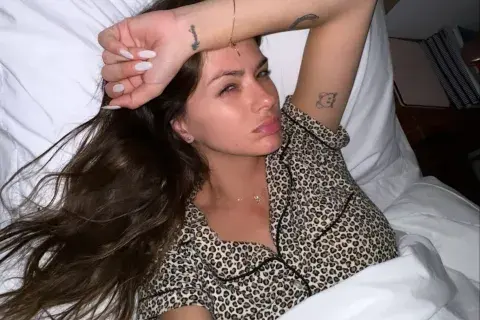 Vestida con un llamativo pijama estampado animal print y ya metida en la cama lista para irse a dormir, la actriz posó mirando a la cámara y, sobre la foto, escribió: “Malditas migrañas”.