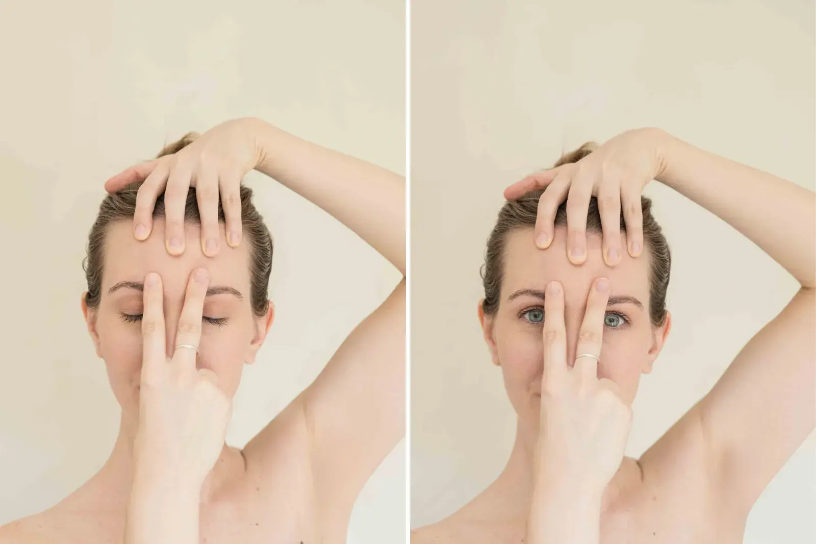 El yoga facial apunta a que el tratamiento no sea localizado sino integral: esas ojeras y bolsas nos dan información acerca del funcionamiento de un sistema, no de un compartimento estanco. Por eso, desde una lógica anatómica, antes de focalizarnos en los ojos, primero liberaramos tensión de los músculos del cuello, el cráneo y la mandíbula. ¿Cómo activamos y tonificamos los músculos circundantes? Levantando el rostro, generando espacios y abriendo canales para oxigenar nuestros tejidos, favorecer la producción de colágeno y elastina y eliminar toxinas. Al mismo tiempo, incorporamos posturas que nos ayudan a calmar el sistema nervioso y a mejorar el funcionamiento hormonal. Como resultado, mejoramos naturalmente el aspecto de nuestra mirada, el tono y luminosidad de nuestra piel. Luego, entramos a las posturas localizadas en párpados.