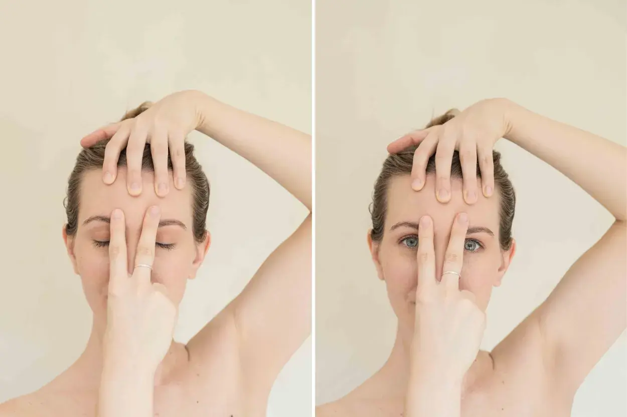 Frente y entrecejo lisos (¡sin bótox!). El movimiento repetitivo de fruncir el entrecejo (y las emociones subyacentes) deja huellas en la frente. Aquí, tres automasajes sencillos para relajarlo. ¡Atenti! Es importante humectar la frente antes con aceite apto para rostro o crema.