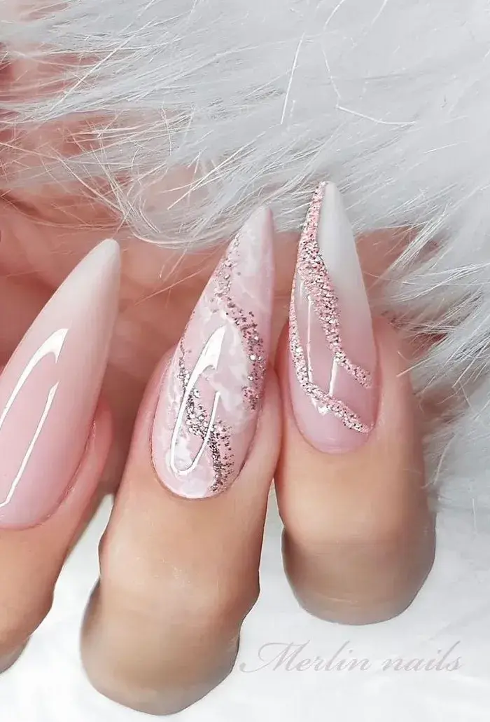 Este diseño juega con el degradé desde la cutícula hacia la punta, incorporando partículas de brillo cada vez más densas en la zona final. Es un recurso sutil que aporta un toque luminoso sin recargar.