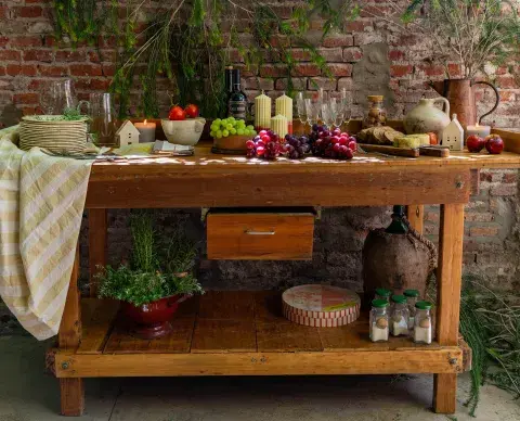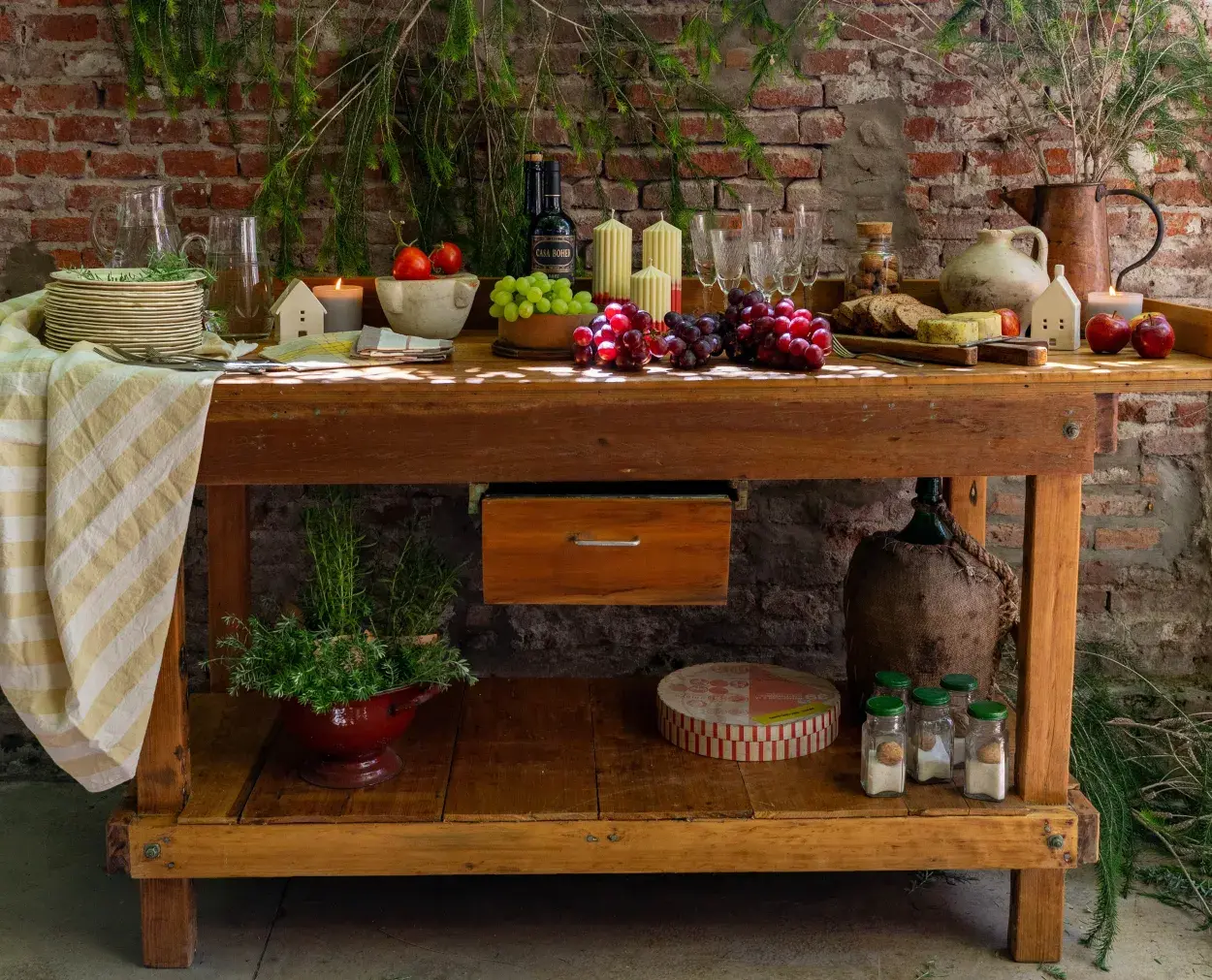 Como apoyo, pero bien protagonista. Esta segunda opción se pensó como mesa de apoyo: siempre útil, sobre todo en los encuentros multitudinarios de fin de año. Se trata de un mueble antiguo y bien rústico que, por su deco, dialoga con la mesa principal. Tiene un mix de elementos de ayer y de hoy: vasijas antiguas, copas de otros tiempos, cacharros que cumplen más de una función y, también, objetos actuales, como el mantel pintado a mano, las velas y las casitas hechas a mano. El cajoncito, además, regala espacio extra de guardado para cubiertos, servilletas o alguna sorpresita para los invitados.