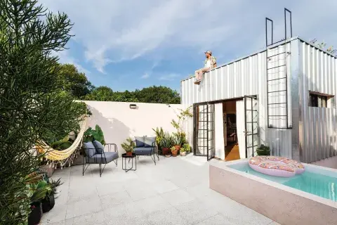 El diseñador Rob Ortiz encontró en este departamento de 1949 la posibilidad de agregarle otra planta y hacer una terraza donde ubicar un living sobre un deck de plástico reciclado con madera y también una huerta.