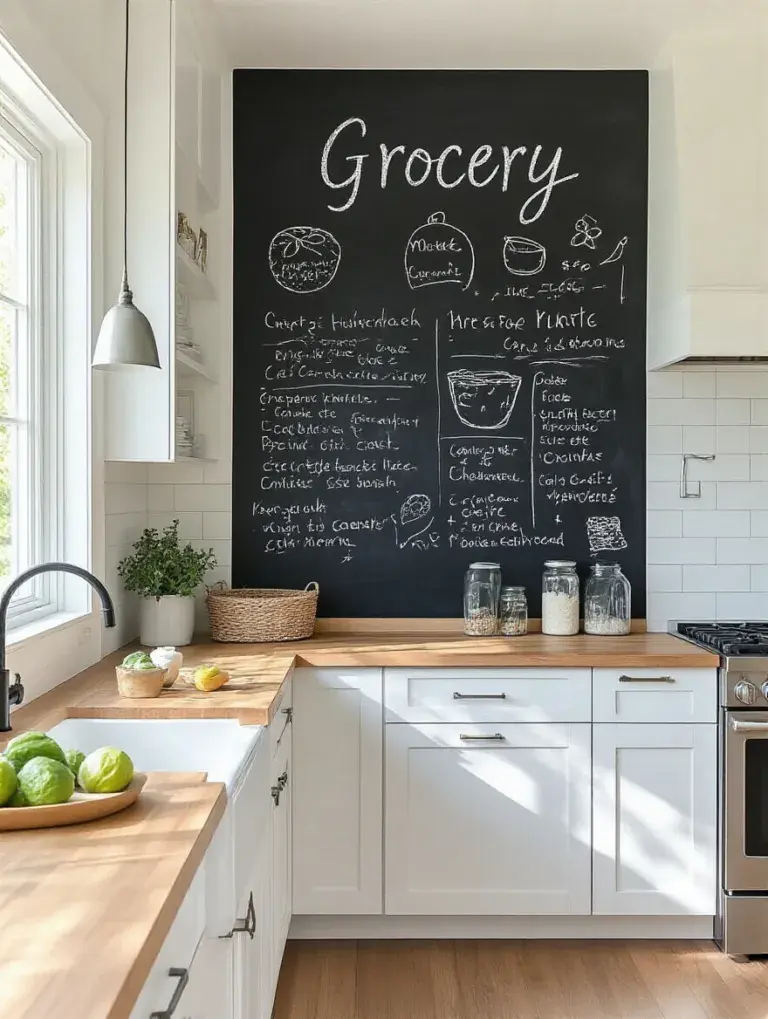 Una pared donde puedas escribir recetas, lista de compras o frases inspiradoras, le da personalidad y es súper práctica. Un consejo: usá marcadores de colores o tizas blancas para mantener un estilo limpio y moderno.