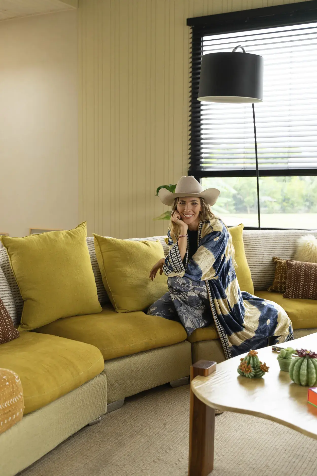 Para decorar el living, se inspiró en los tonos beige, mostazas y marrones. “Me imaginaba una idea de barco y su oleaje. Quería generar curvas, por eso el sillón curvo y la chimenea que acompaña ese movimiento”. Las texturas son claves: materiales nobles en los textiles, el cuero de la mesa ratona o la madera de los tochitos. “La mezcla de texturas, colores y estampas podría ser un montón, pero siento que todo eso convive dentro de un mundo que a mí me representa y refleja mi personalidad”.