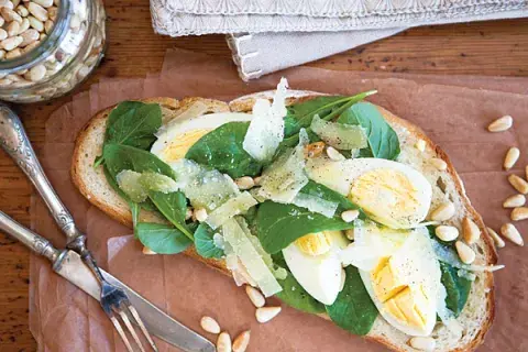 Tostar el pan y frotarlo con un diente de ajo para darle sabor. Arriba, colocar (en este orden) las hojas de espinaca cruda, el huevo duro cortado previamente en cuartos, algunas escamas de parmesano y los piñones. Por último, rociar con un buen chorro de aceite de oliva, sal y pimienta.