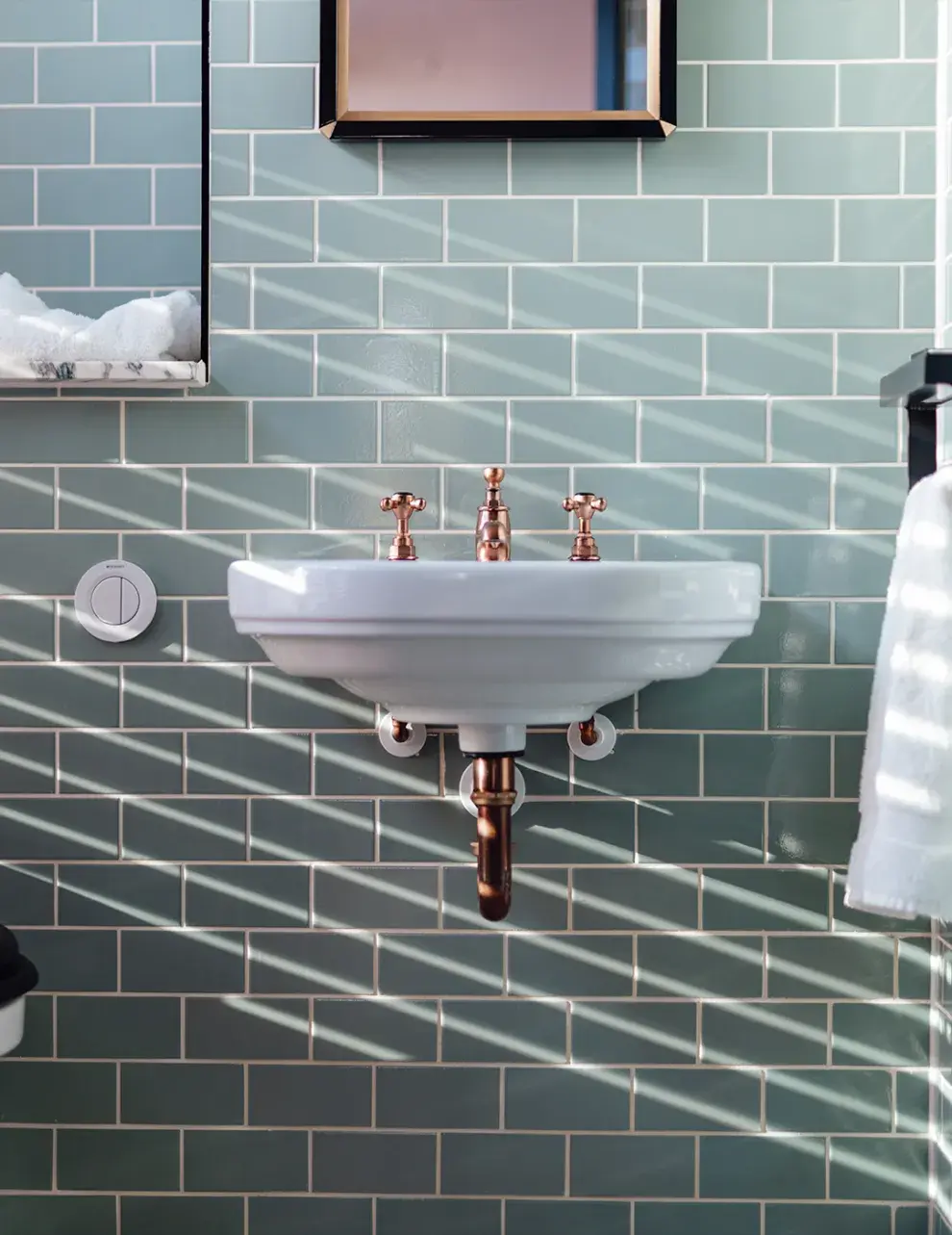 • Animáte a los colores vibrantes para un toque moderno: Si querés que tu baño tenga personalidad, podés elegir colores más fuertes como turquesa, verde menta o incluso un rosa pastel. Pintar solo una pared o una sección de azulejos con un color vibrante es una forma genial de darle un toque moderno sin que quede muy recargado.