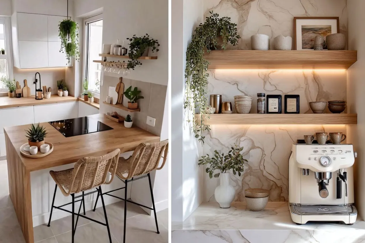 Más que una cafetera sobre la mesada, las coffee stations (estaciones dedicadas al café) se consolidan como el epicentro del bienestar en casa. Diseñadas con estantes flotantes, bandejas y utensilios organizados, estas zonas invitan a crear un pequeño ritual diario. La idea no es solo preparar café, sino convertir ese momento en una pausa consciente que enriquece el día.