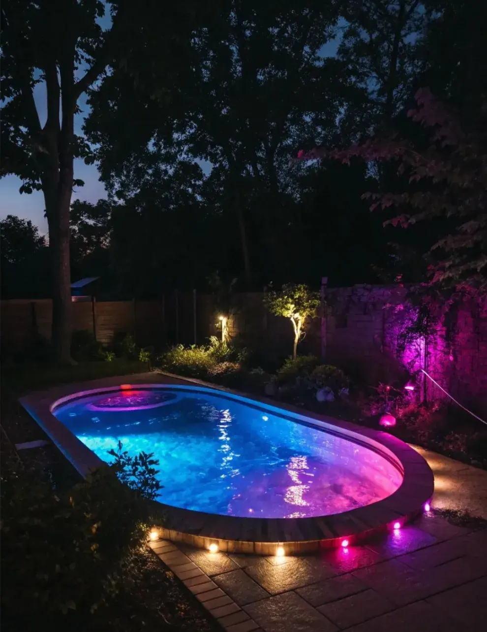 Incorporar luces sumergidas, faroles o tiras LED transforma la mini pileta en un rincón encantador al caer la noche. Elementos como piedras, macetas y mobiliario cómodo completan el ambiente, generando un espacio atractivo y funcional, ideal para relajarse o compartir momentos con amigos.