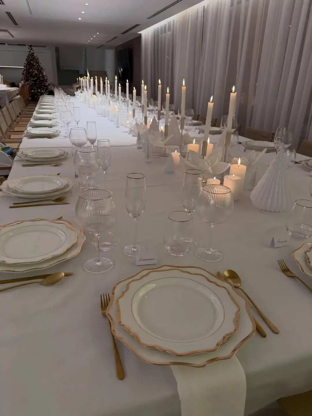 Predominan los blancos, crudos y beige, combinados con verdes profundos, rojo navideño y toques dorados. En algunas mesas, el negro aparece como base elegante, dando como resultado sofisticación sin rigidez.