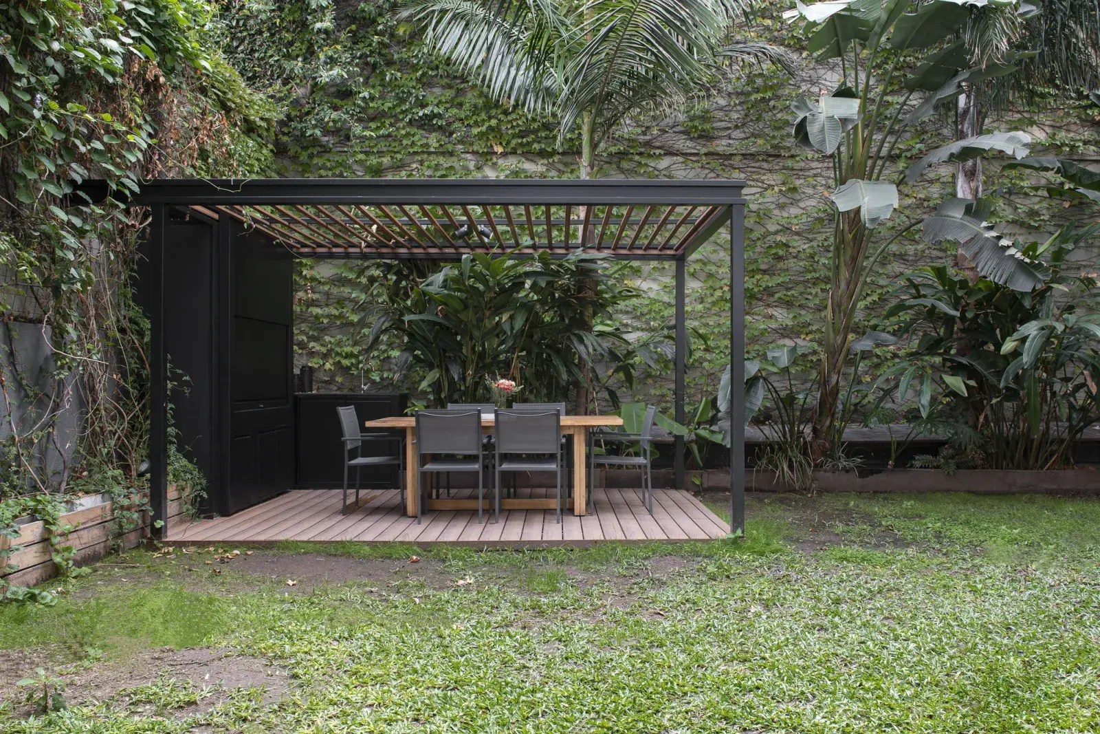 Al fondo de un jardín, donde antiguamente había un refugio construido en troncos de pino, se diseñó una estructura de hierro y madera: una pérgola liviana de tubos estructurales alberga una mesada de bacha oculta, mesa con sillas y la parrilla de siempre revestida. El techo de varillas permite el paso del sol y genera mediasombra mientras dialoga con el deck que le da sustento a la caja.