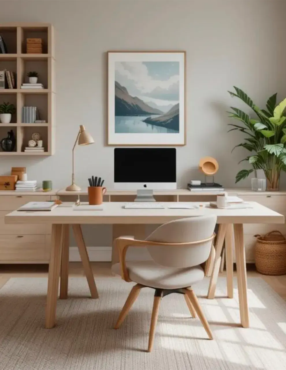 Los tonos claros, como blancos, beige o grises suaves, ayudan a que la oficina se vea más amplia y luminosa. Podés combinarlos con pequeños toques de color en accesorios o cuadros para aportar personalidad sin recargar el ambiente.