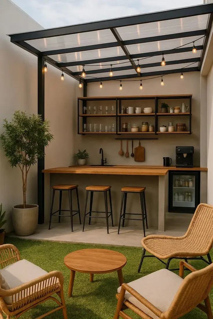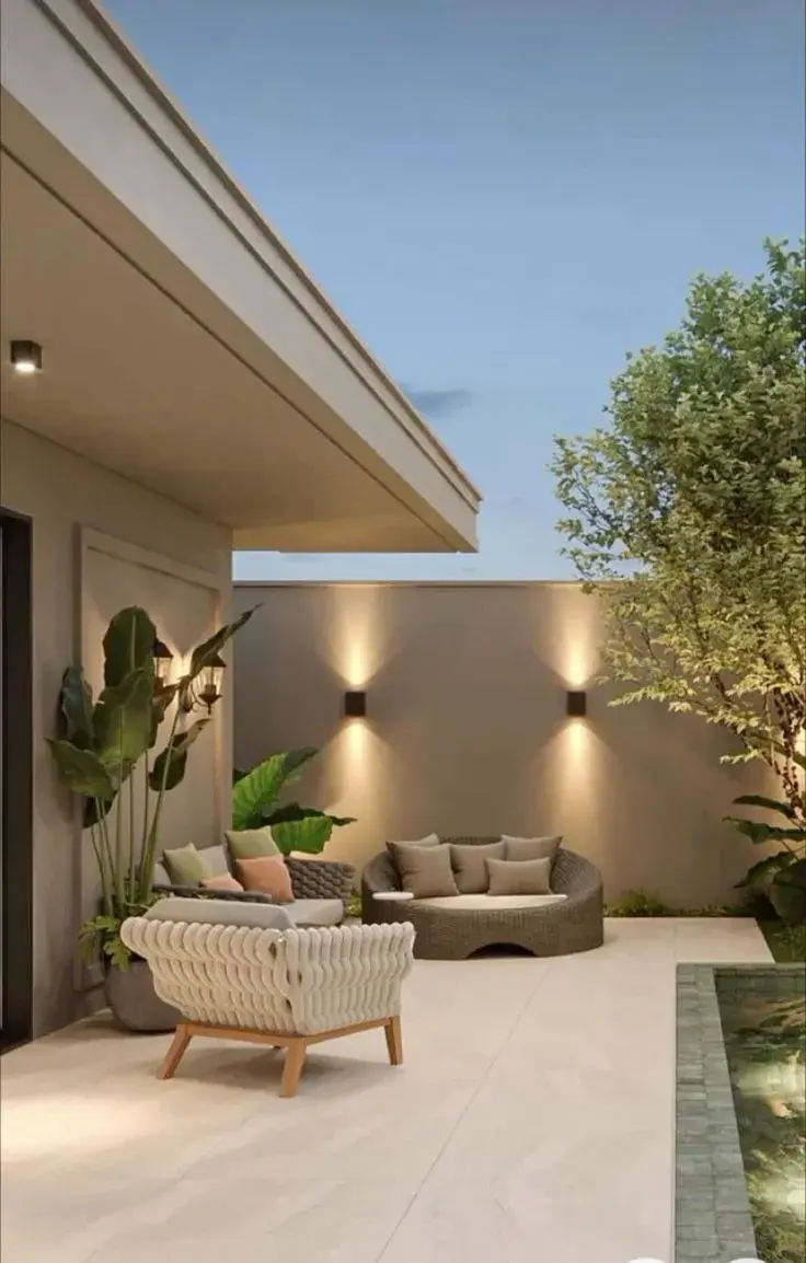 La luz transforma por completo un patio. Guirnaldas cálidas, faroles o apliques de pared crean clima y prolongan el uso del espacio cuando cae el sol. En patios pequeños, la iluminación indirecta es clave: suma calidez y hace que el ambiente se perciba más amplio.