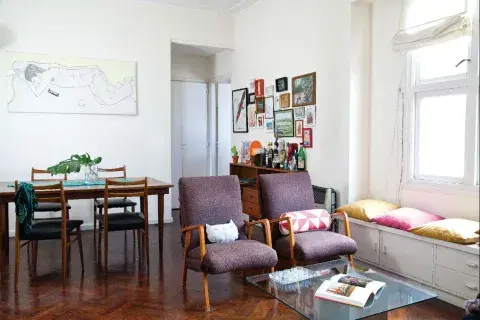 Dice que, al momento de armarlo, su búsqueda fue principalmente por MercadoLibre y en el Mercado de Pulgas. Los silloncitos que están debajo de la barra los heredó y le encantaron. Pero les hizo unas fundas con tela que compró en Picnic y les sumó unos almohadones de estampas geométricas. Sobre un vajillero de madera armó su bar, y llenó la pared de cuadros con obras de pequeños formatos, todas regalos de amigos artistas.