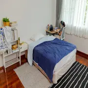 Así, el dormitorio se delimita y separa del living. El respaldo es una pared de ladrillo a la vista.