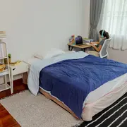 La ropa de cama y los textiles refuerzan la atmósfera de descanso.