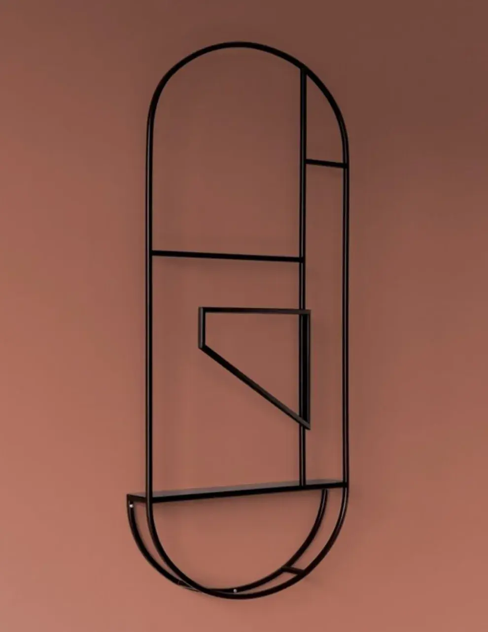Con estética decorativa y líneas geométricas, combina un arco para chaquetas, un estante pequeño y una percha plegable. Queda fijo a la pared sin ocupar piso y suma un toque moderno al ambiente. Ideal para integrar la función de tender al estilo del living.