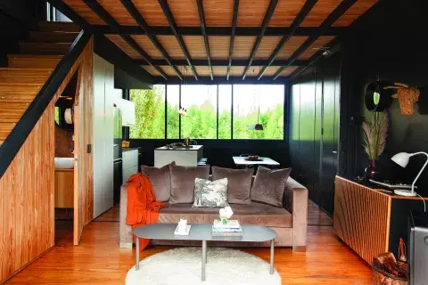 En los dormitorios y el baño la madera es protagonista absoluta: la usaron sin límites como una caja que contiene y regala calidez. Después, detalles en negro y ventanales con las mejores vistas: “Hicimos un balance entre vidrio y madera, porque la idea no era hacer una glass house”, cuenta.