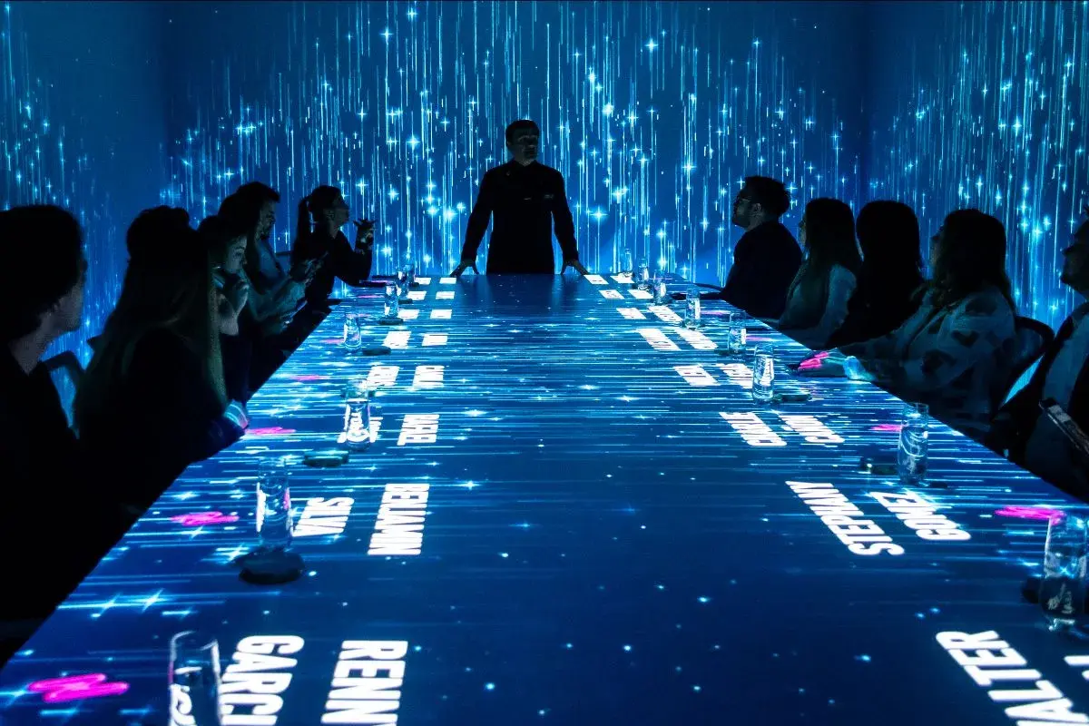 A las 20:30 pasamos a una antesala donde el maestro de ceremonias de la experiencia nos daba la bienvenida a una Buenos Aires del futuro y una luz de neón nos invitaba a pedir un deseo. Cinco minutos después, estábamos en un cuarto futurista con una mesa central y paredes blancas, que al estilo lienzo, se pintarían con paisajes de 10 mundos diferentes a través de proyecciones.