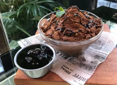 Sugar Ray tiene una tremenda porción de mousse de chocolate extra cremosa (a base de chocolate 70% cacao) que sirven con un crocante de cacao por encima –para sumar texturas–, acompañado de un pote de reducción de frutos rojos para servir a gusto. Av. de Mayo 323, Ramos Mejía. @rockyrestaurantbar