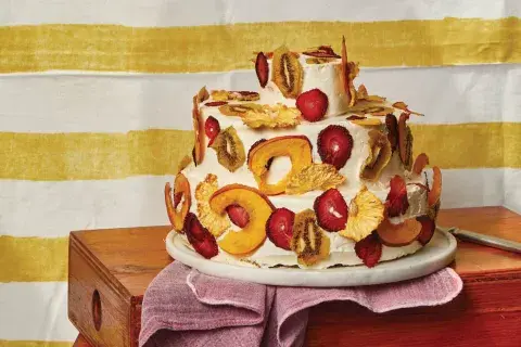 Prender el horno a 170 °C. Enmantecar y enharinar el molde. Cremar la manteca con los azúcares 3 minutos en batidora. Unir la esencia de vainilla, el yogur, el aceite y la leche. Agregar los huevos y luego todos los ingredientes secos y seguir mezclando 4 minutos más. Volcar en un molde de 24 cm y hornear 35 minutos. Dejar enfriar. Para el frosting, cremar la manteca con el azúcar en batidora hasta que esté blanquecino, agregar de a poco el queso hasta homogeneizar. Para el armado, cortar en tres partes el bizcochuelo. Colocar la primera capa con la miga hacia arriba y embeber con almíbar. Poner una capa de frosting, arriba la segunda capa de bizcochuelo, embeber nuevamente con almíbar, cubrir con dulce de leche y colocar la última capa. Enfriar 30 minutos en el freezer. Luego, cubrir la torta con frosting, usando una espátula. Decorar a gusto con frutas de estación. Si se tiene deshidratadora, deshidratar rodajas de frutas 24 hs. a 60 °C. Si no, usar frutas frescas o flores comestibles.