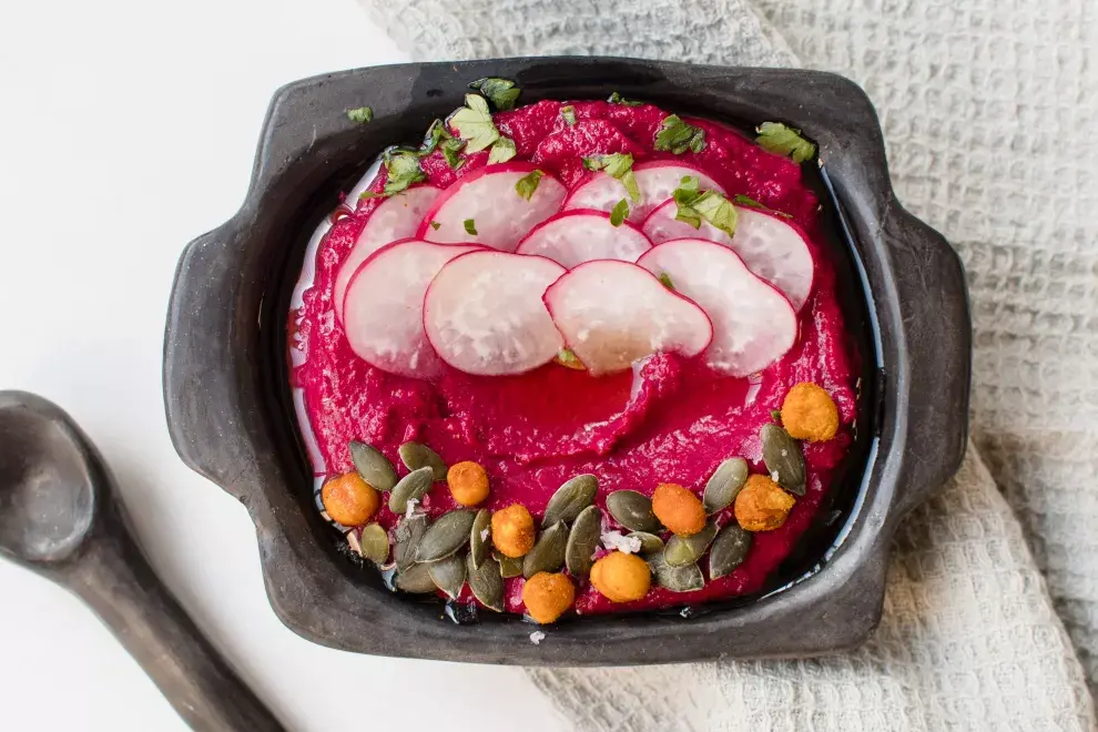 Poner en el vaso de la licuadora o mixxer los garbanzos, las remolachas en cuartos, el ajo en polvo, el aceite de oliva, el jugo de limón, tahini, sal, pimienta y licuar hasta obtener una pasta homogénea.3