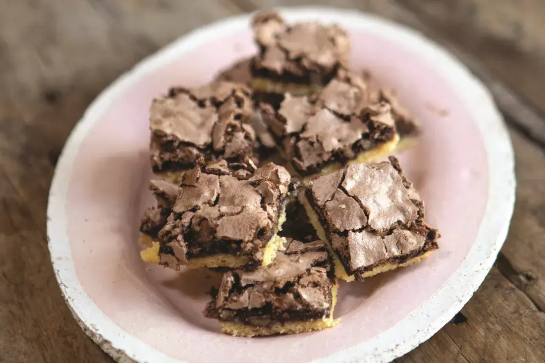 Precalentar el horno a 180 °C. Mezclar los secos, desarmar la manteca con las manos hasta formar un arenado y unir con las yemas. Dejar enfriar en heladera durante 30 minutos. Luego, forrar la base de una placa rectangular de 25 x 35 cm, enmantecada y enharinada. Precocinar la masa sola por 10 minutos aproximadamente para blanquearla. Retirar del horno y untar con mermelada de frambuesas. Por otro lado, batir las claras con el azúcar y el cacao hasta obtener un merengue. Agregar las nueces picadas al batido. Volcar sobre la masa blanqueada y untada con mermelada. Hornear todo junto por 25 minutos o hasta que el merengue esté seco. Cortar todavía tibio, dejar enfriar y servir.