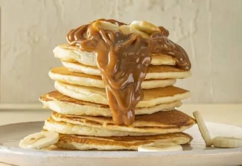 - Serví los pancakes en torre, con rodajas de banana y un buen toque de dulce de leche Squeeze por encima.
