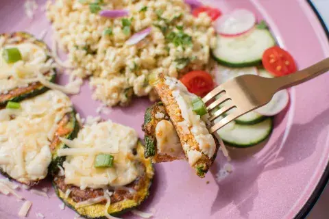 En una sartén caliente, untada con aceite de oliva colocar los círculos, vacíos de zucchini.4