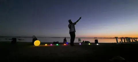 Ezequiel Brahim, guía en esta experiencia, pone a brillar unas esferas de LED que grafican esa construcción a escala de nuestro vecindario cósmico. - Créditos: Gentileza Ezequiel Brahim