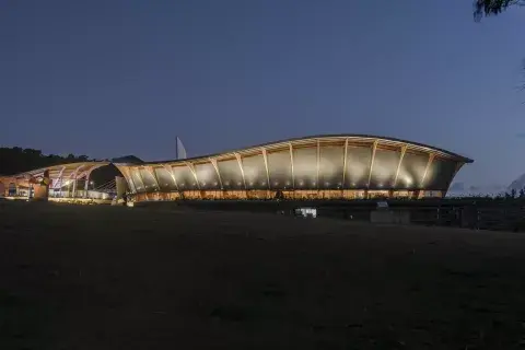 Inspirada en la forma de un gran arca, con exuberantes formas onduladas que dialogan con el paisaje de lomas, árboles y un lago, la estructura del MACA es una escultura en sí misma, hecha con madera de grandes eucaliptos uruguayos que fueron tratados, cortados y numerados en Francia para volver luego a Manantiales.