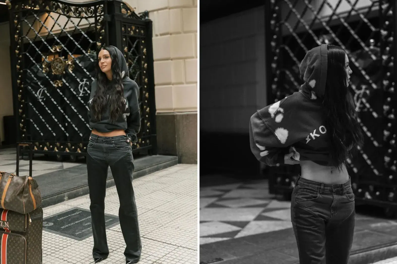 En esta ocasión, la modelo eligió un jean de la marca argentina Kosiuko que lo combinó con un buzo crop con capucha y zapatos en punta. Un look urbano pero con un toque elegante.