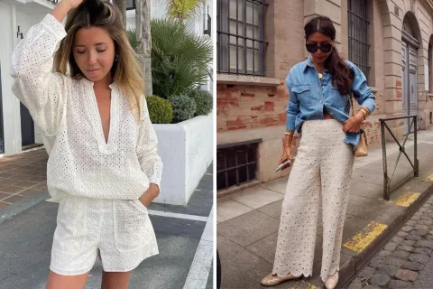 Este tejido es uno de los grandes exponentes del “lujo silencioso”: no necesita brillos ni estridencias para destacar. Las blusas y tops en broderie se combinan con jeans anchos, palazzos fluidos, faldas globo y bermudas de vestir, logrando ese mix entre lo simple y lo elegante que define a la temporada.