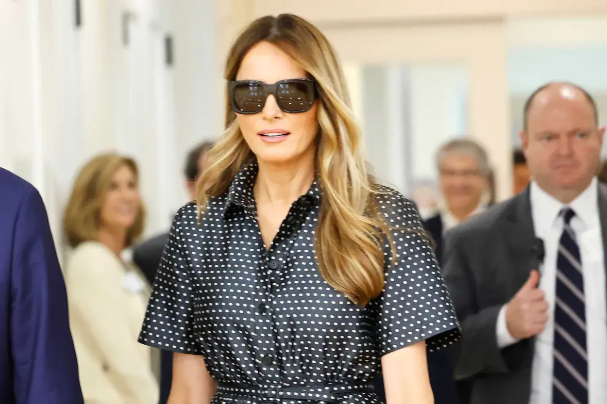 Melania Trump acompañó a Donald Trump a una de sus tantas visitas protocolares, en el marco de las elecciones presidenciales de Estados Unidos, y lució un atuendo que se volvió viral. El diseño elegido era un vestido camisero a lunares blancos por debajo de la rodilla y con falda evasé.