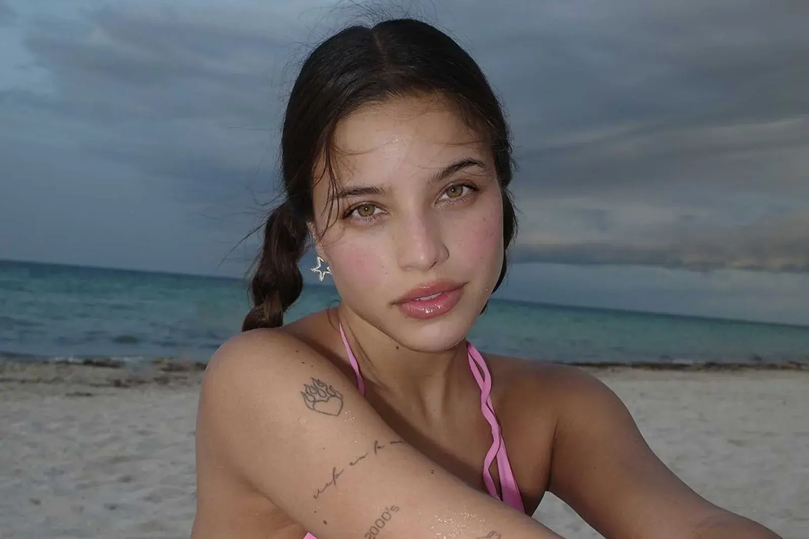 Emilia posó desde una playa soñada luciendo este estilismo tendencia y sumó como accesorios aros en forma de estrella y una pequeña cadena en la cintura, en combinación con los pendientes.