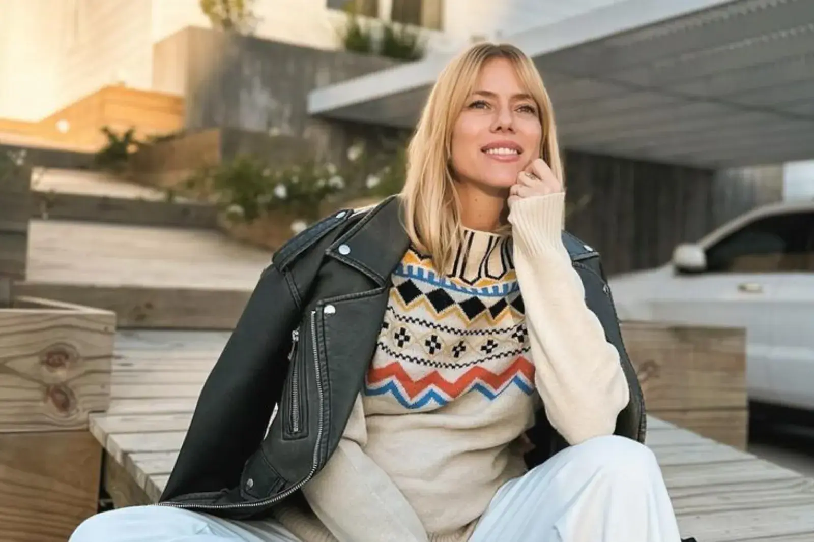 Sentada cómodamente en la escalera de su casa, la panelista de Los 8 escalones del millón (eltrece) posó con un sweater negro con el pecho cubierto en pedrería combinado con un par de pantalones rojo rubí de gamuza. En cuanto a los accesorios, optó por una cartera de mano cilíndrica a juego con el pantalón y un par de aros dorados estilo chunky.