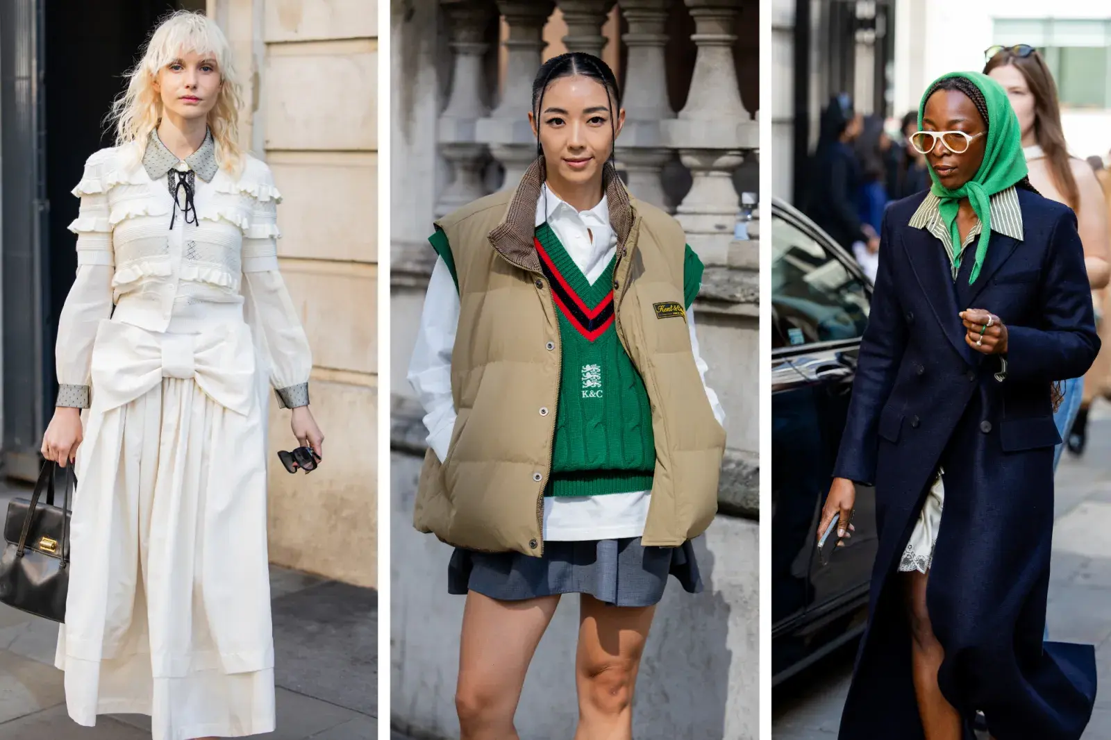 Después de su presencia en la Semana de la Moda de Nueva York, no podemos dejar de observar que el estilo preppy continuó ganando terreno en el street style londinense. Los asistentes adoptaron este look con un giro contemporáneo: jerseys y chalecos de punto con un pronunciado escote en V, camisas con cuello y faldas plisadas se combinaron con zapatillas deportivas y abrigos clásicos, como trenchs y camperas puffer. Esta mezcla entre lo tradicional y lo moderno es perfecta para quienes buscan un estilo pulido pero con personalidad.
