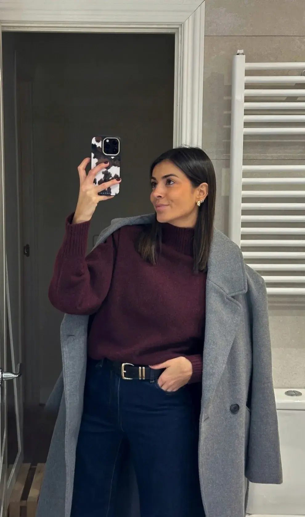 El sweater cuello tortuga funciona perfecto como primera capa. Usarlo debajo de un tapado largo o un blazer genera un look sofisticado y muy invernal, además de sumar abrigo sin necesidad de múltiples capas.