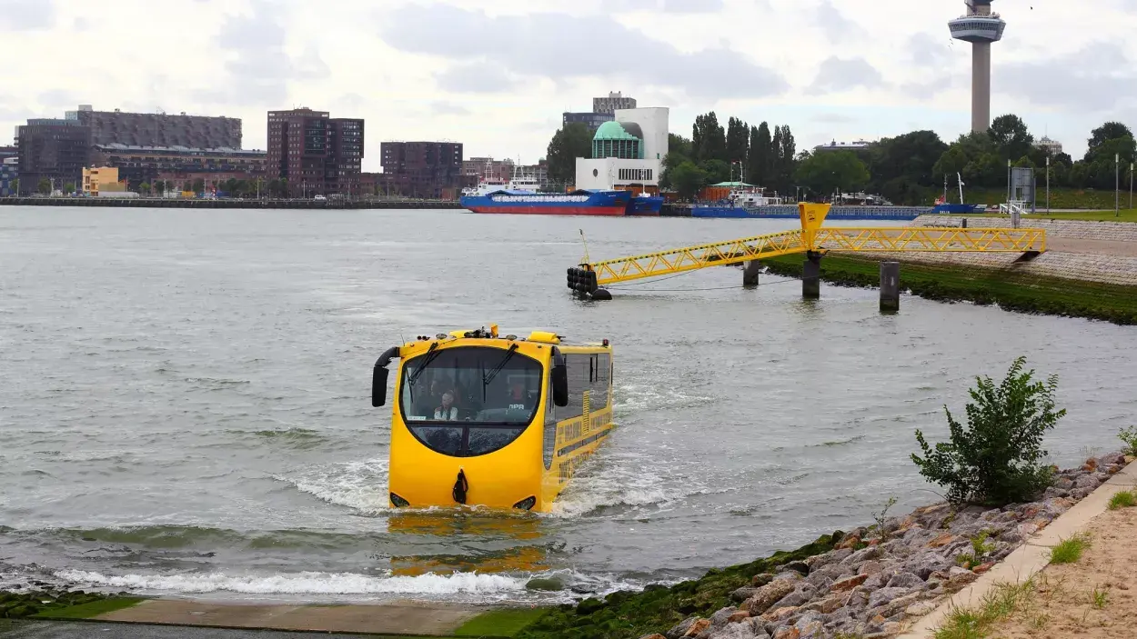 De repente, ¿un colectivo amarillo se sale del asfalto e ingresa en el agua? Desde 2010, la escena se ha vuelto común para los vecinos de Rotterdam, pero no deja de impresionar a los que están de paso. Mientras tanto, a bordo las risas y los gritos están garantizados. Como en una montaña rusa. El Splash Bus es anfibio y se perfila como el medio ideal para conocer Rotterdam, la segunda ciudad más importante de los Países Bajos y uno de los puertos más grandes del planeta. Allí el agua es omnipresente tal como lo comprueban los 40 pasajeros del bus. El recorrido pasa calles, puentes y canales y culmina en el medio del río Mosa, frente al emblemático Hotel New York, uno de los edificios más reconocibles de la ciudad. Ocupa la antigua sede de la Holland America Line.