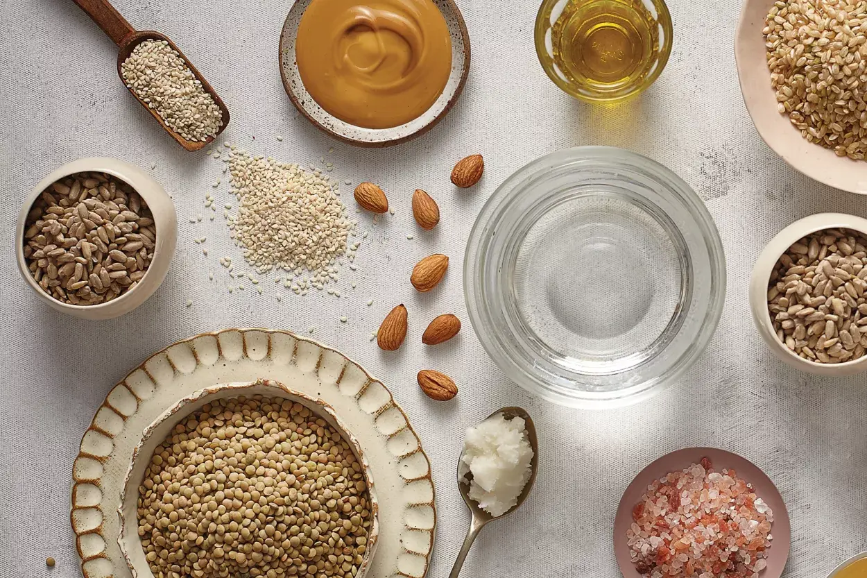 - ¿Qué lleva? 50 g de almendras / 2 cucharadas soperas de semillas de sésamo / 40 cc de jugo de limón / 80 cc de aceite de oliva / 400 g de lentejas cocidas / 1 cdta. de postre de sal rosa.