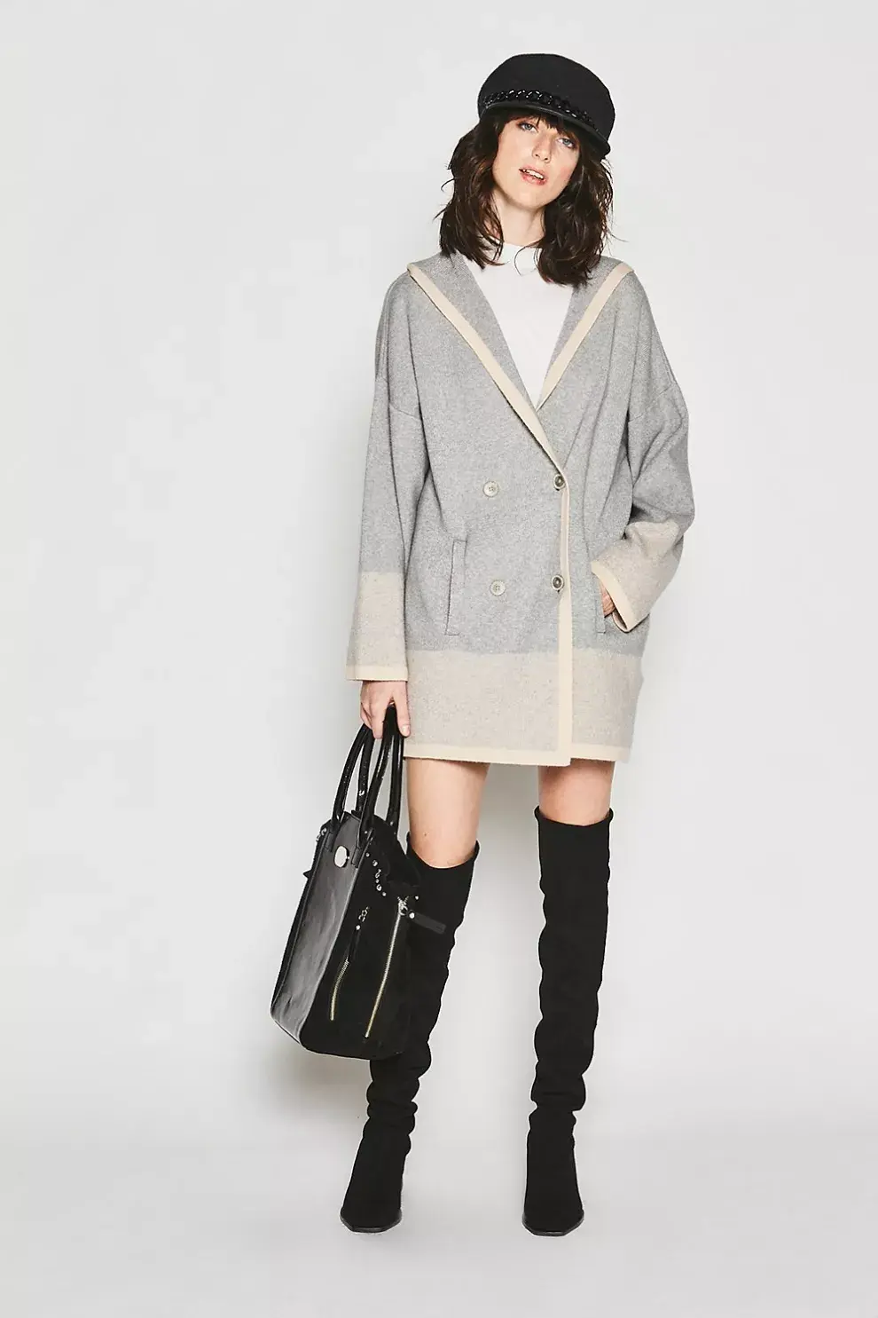 El cardigan Viking de Uma, de punto bien tupido, tiene un cruce en el centro delantero con cuatro botones, lleva capucha y una combinación de gris melange con otro tono más claro en ruedos y puños.