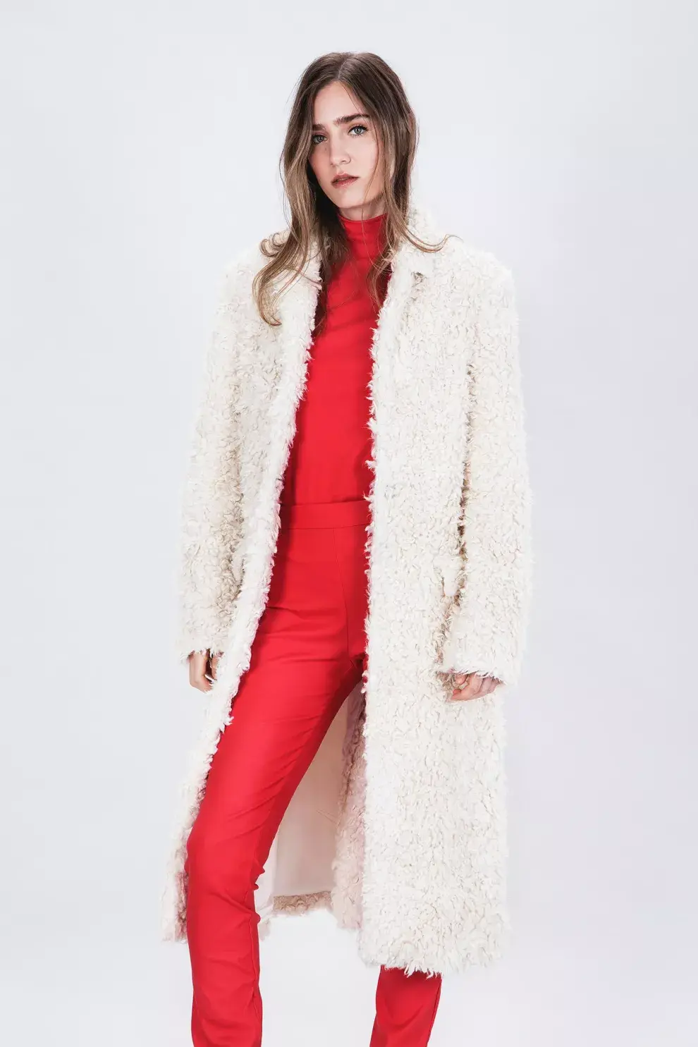 Si te quedaste con las ganas de un tapado largo sastrero, Penny de Ayres está confeccionado en piel de cabra rizada sintética, con solapas rectas, bolsillos delanteros y tajo en la espalda.
