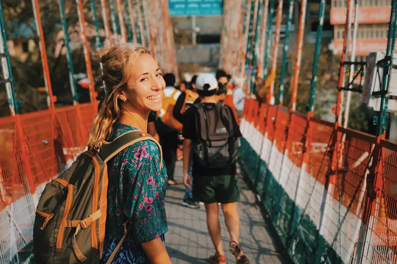 Cruzando el puente que une los mundos de Rishikesh, cuidando que los monos no le saquen la comida de la mochila.
