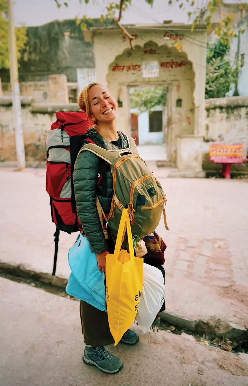 Volamos vía Barcelona, donde hicimos nuestra primera parada para trabajar, a la vuelta me esperaba un taller de 40 mujeres en la ciudad y tenía que dejar todo listo. A esa altura Italia ya se estaba complicando, por eso no nos pareció una buena idea pisar tierras tanas para salir rumbo a India vía Roma. Así que cancelamos el pasaje y sacamos otro vía Finlandia. No lo podés creer, pero en Helsinki a esa altura había solo un caso y eso nos dejaba tranquilos. Nos estábamos yendo para arriba, para volver a bajar, todo por viajar por una ruta menos peligrosa. Luego de 12 horas, una escala y un par de husos horarios, con una botella de alcohol en gel y un barbijo de pintor con el que se nos complicaba respirar (porque no habíamos conseguido otro en la farmacia), llegamos a Delhi.